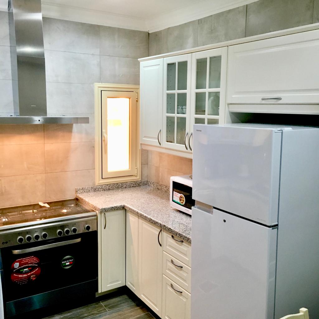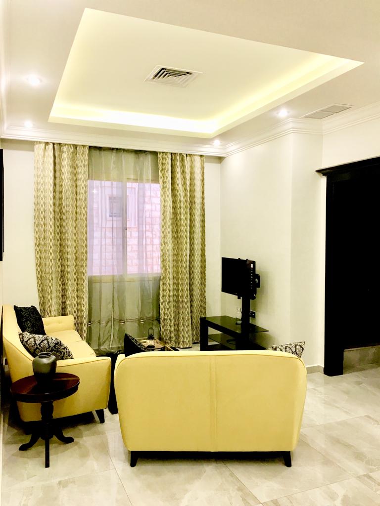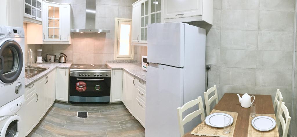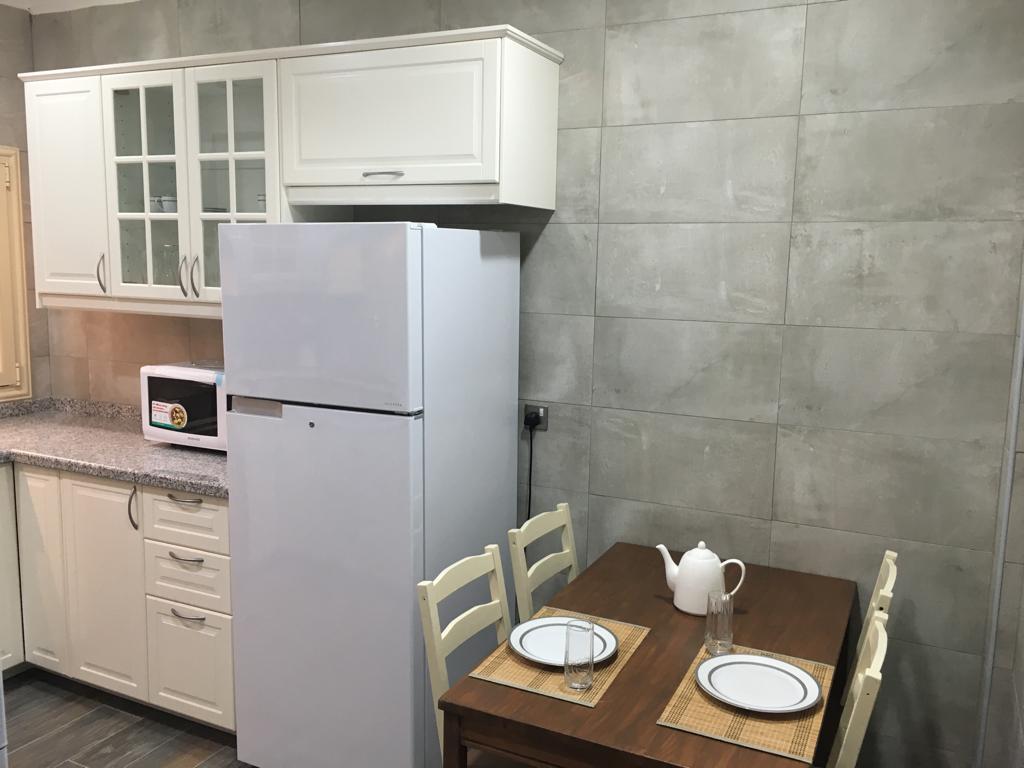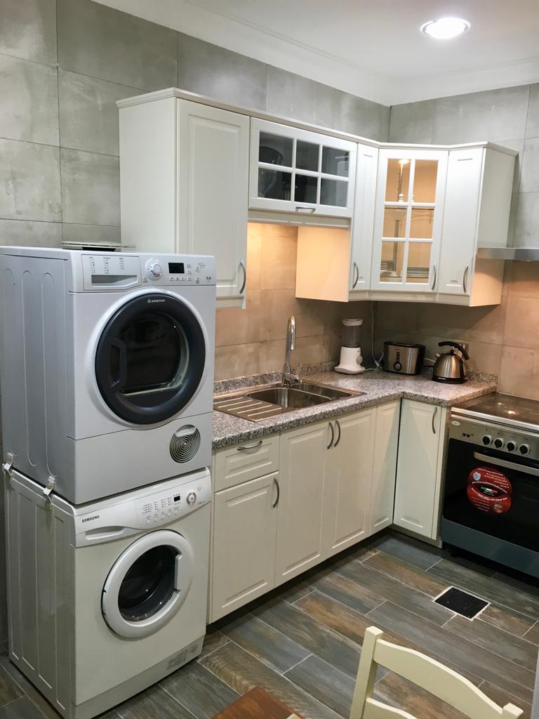 Two bedroom apartment one is a master bedroom, 2 bathrooms, fully furnished and equipped kitchen including dry cleaner, on the second floor with no tenants on top, private elevator, cctv security cameras, Intercom, 1 Private covered parking, satellite, central AC